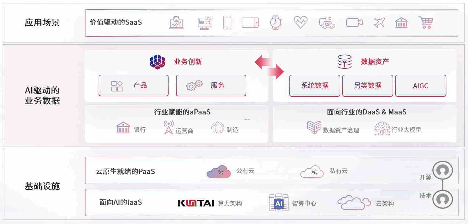 数字时代,,围绕企业数字化转型的关键要素,,金年汇数码开创性的提出数云融合战略和技术体系框架,,,,着力在云原生、、、数字原生、、AI原生和信创产业上架构产品和服务能力,,,为处在不同数字化转型阶段的快消零售、、、汽车、、金融、、、、医疗、、、、政企、、教育、、、、运营商等行业客户提供泛在的敏捷IT能力和融合的数据驱动能力,,构建跨界融合创新的数字业务场景和新业务模式,,,助力企业级客户建立面向未来的核心能力和竞争优势,,,,全面推动社会的数字化、、智能化转型升级。。